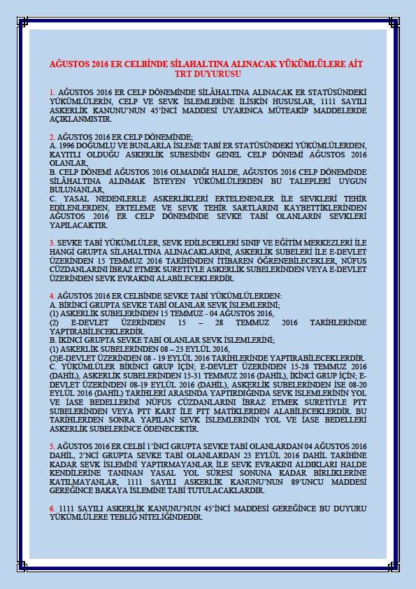 Ağustos 2016 Er Celbinde Silahaltına Alınacak Yükümlülere İlişkin Trt Duyurusu