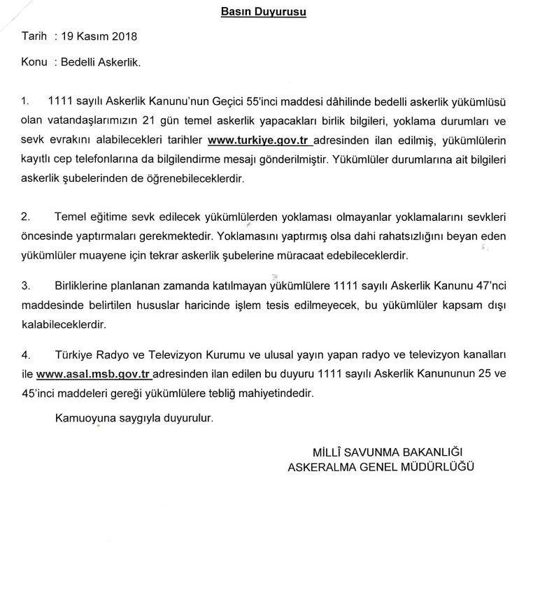 Bedelli askerlik hizmetine ilişkin yoklama, celp ve sevk hakkında Milli Savunma Bakanlığı'nın duyurusu ekte sunulmaktadır.
