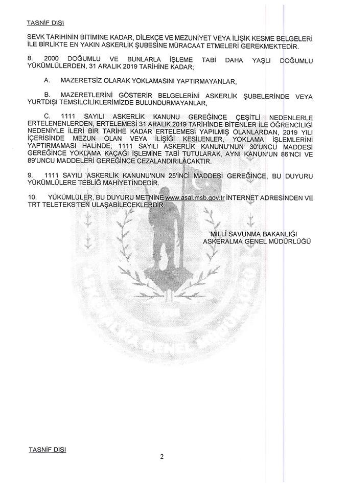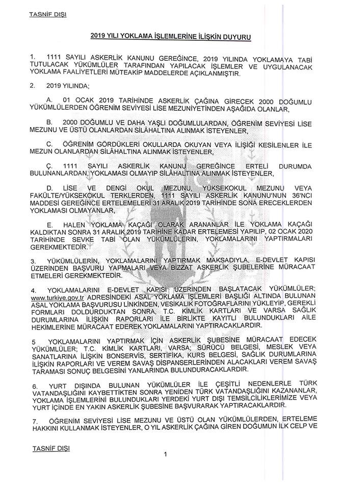 2000 doğum ve bu doğumlularla işleme tabi yükümlülerin yoklama işlemlerine ait tebliğ yerine geçecek duyuru ekte sunulmaktadır.