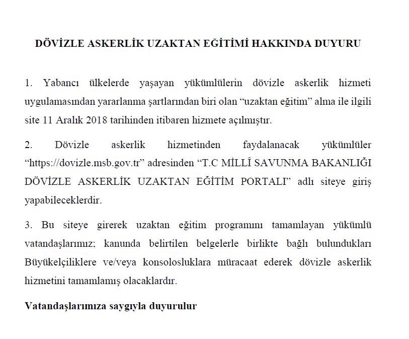 Dövizle askerlik uzaktan eğitimine ilişkin duyuru ekte sunulmaktadır.